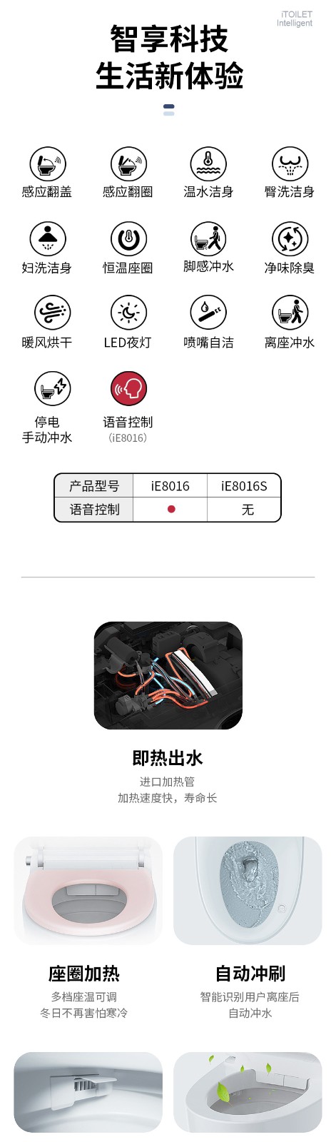 3、主要功能:AI語音控制(可選)、著座感應(yīng)、腳感翻蓋/翻圈/沖刷(可選)、停電(接USB)沖刷、暖風(fēng)烘干、無線遙控、凈味除臭、